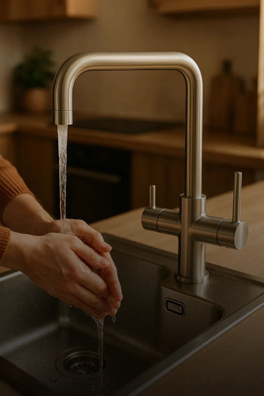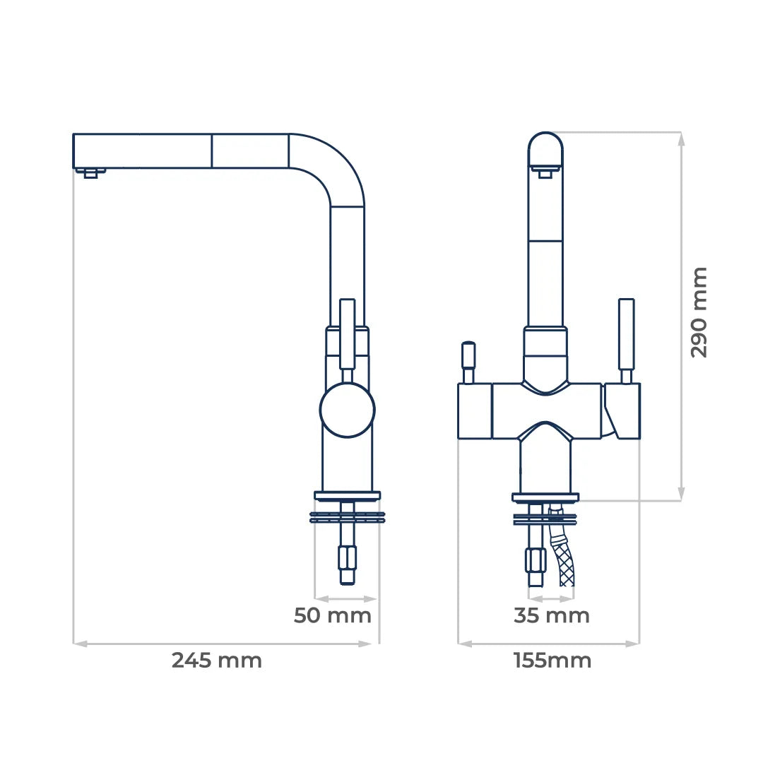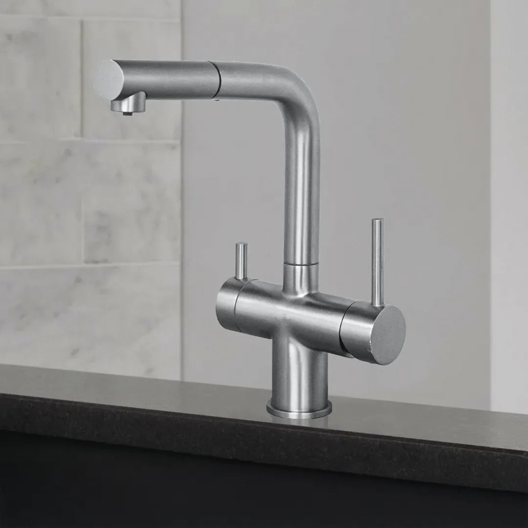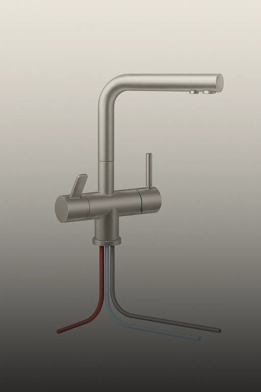 Der Evodrop EW316 3 Wege Wasserhahn vereint Design, Komfort und Flexibilität in einem. Über den rechten Hebel steuerst du dein Leitungswasser, sprich Warm- und Kaltwasser und über den linken Hebel dein gefiltertes Trinkwasser.