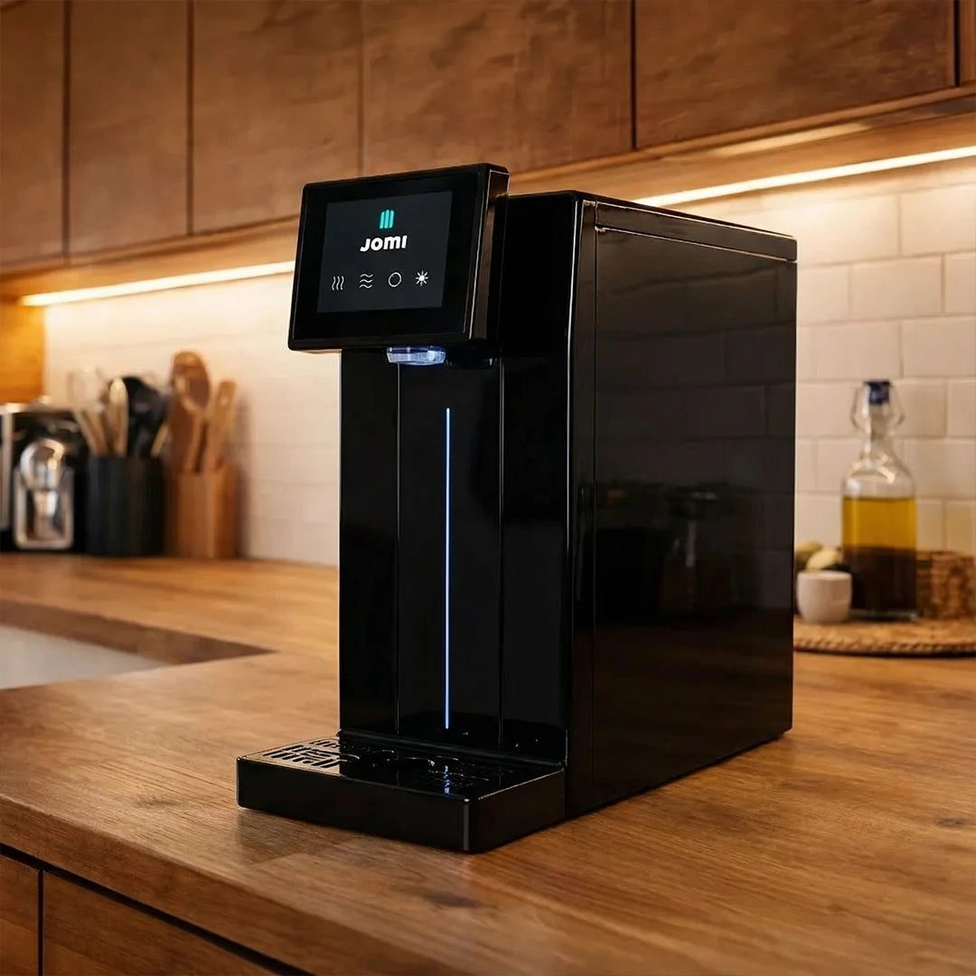 Die Jomi Frizz-On Auftischanlage wird direkt auf der Arbeitsfläche platziert. Die Anlage wird an einem Festwasseranschluss installiert und funktioniert so ohne festen Wassertank.